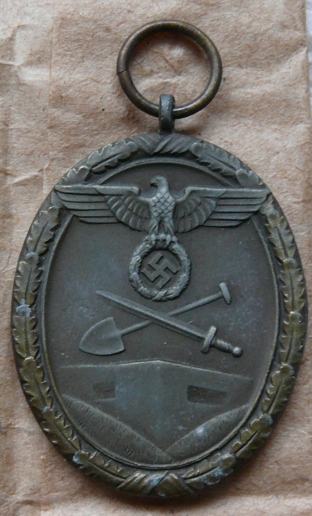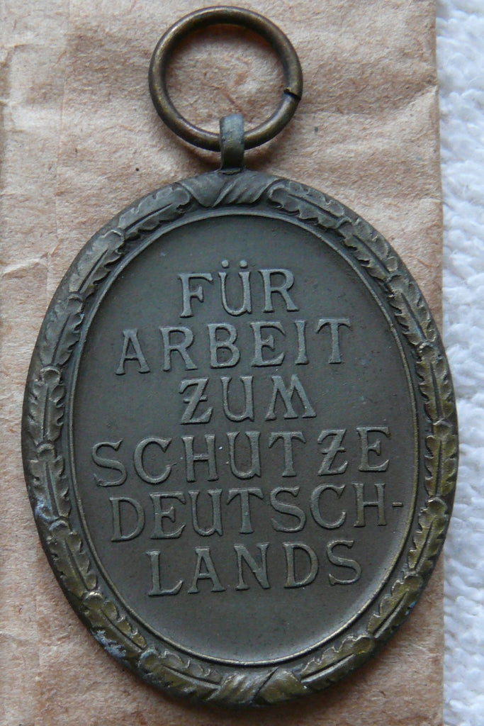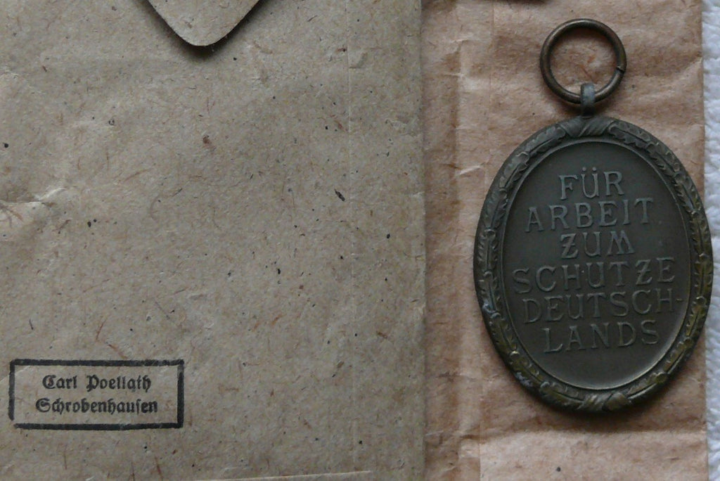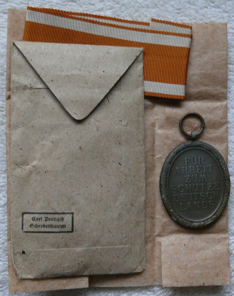 Westwall medal Unmarked medal ,Die-Struck in zinc, with Original Packet of issue and tissue papergood length piece of Original RibbonPacket marked Carl Poellath of Schrobenhausen Excellent unissued condition